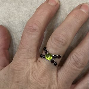 darin sitzt der grüne Bernstein Carbonchon 12 mm D u.8 mm hoch.